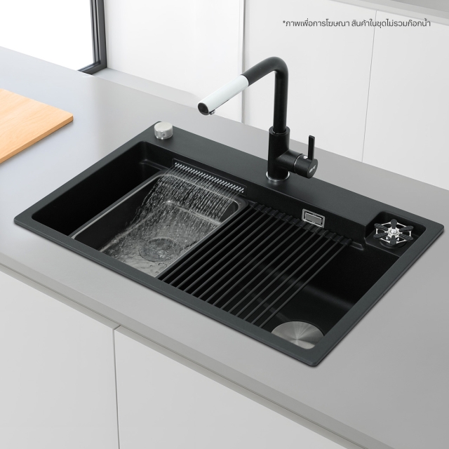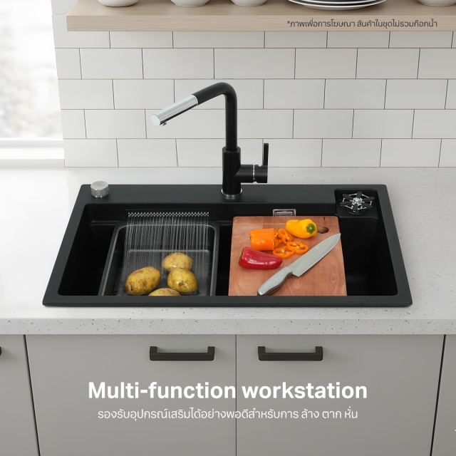Multi-function workstation อ่างล้างจานถูกออกแบบมาให้มีพื้นที่รองรับอุปกรณ์เสริมได้อย่างพอดี ไม่ว่าจะเป็นการล้าง หั่น หรือพักวัตถุดิบในพื้นที่เดียว