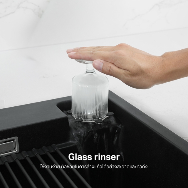 Glass rinser ติดตั้งมาอย่างลงตัวไปกับซิงค์โดยไม่เปลืองพื้นที่ ใช้งานง่าย ล้างแก้วสะอาดทั่วถึง พร้อมเติมเต็มความสะดวกและยกระดับครัวให้สมบูรณ์แบบยิ่งขึ้น