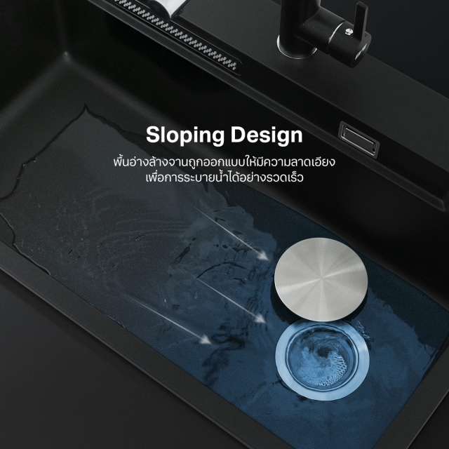 พื้นอ่างล้างจานถูกออกแบบให้มีความลาดเอียง ช่วยให้ระบายน้ำออกจากอ่างได้อย่างรวดเร็ว
