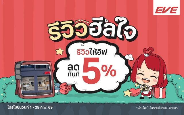 รับส่วนลด 5% เมื่อซื้อสินค้าที่มีมูลค่าต่อใบเสร็จมากกว่า 19,990 บาทขึ้นไป กรอกโค้ด EVENY003